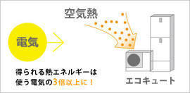通常、お湯を沸かす際には火を使って沸かしますが、エコキュートは火を使わず空気中に含まれている自然熱や太陽の光から発する熱を集めてお湯を沸かします。